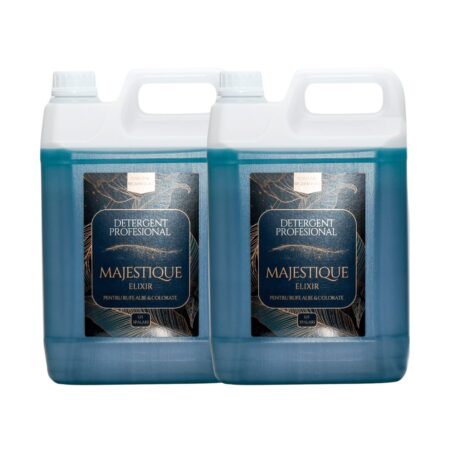 Pachetul include 2 x5L de detergent profesional Majestique Elixir cu bicarbonat, perfect pentru albit și protejarea hainelor colorate.